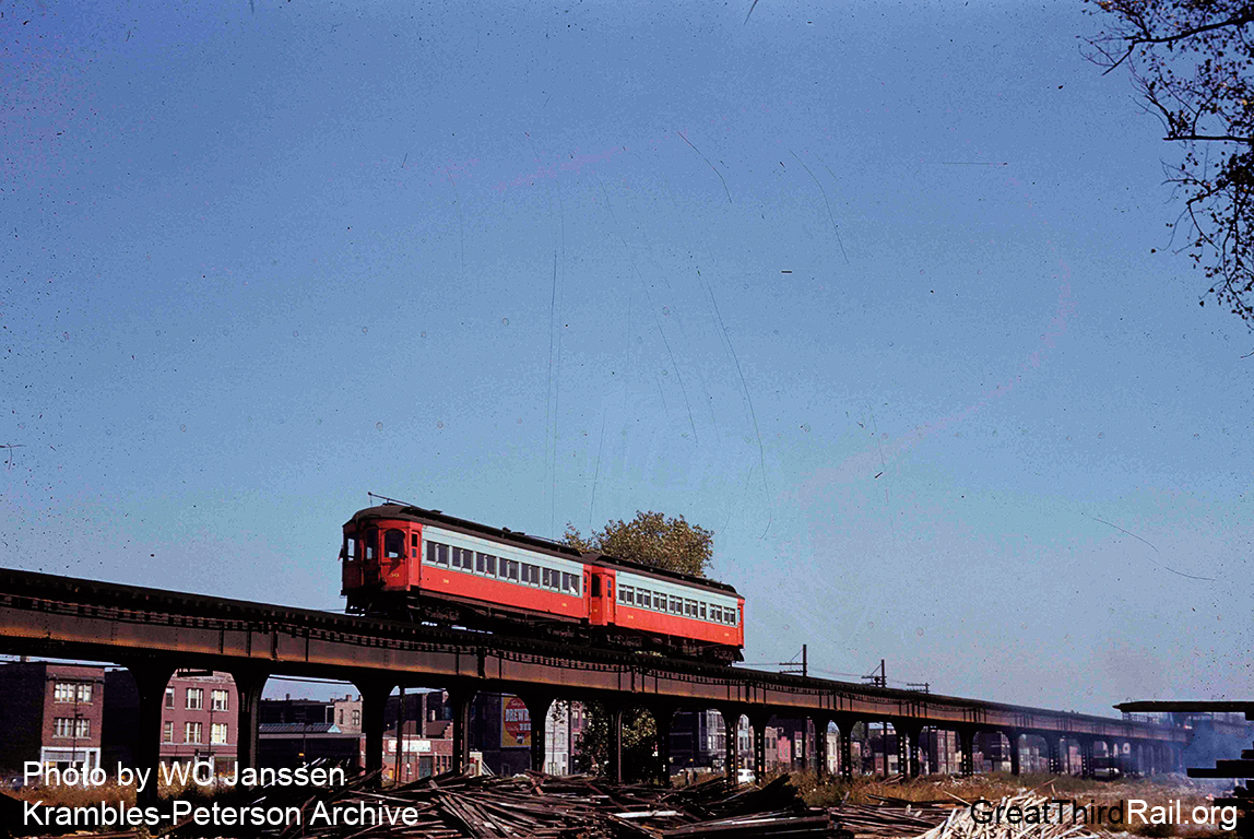 A two car train makes an easbound run as it nears a station on the Garfield Park “L” circa 1952. Car 36 brings up the rear. Operation over the “L” won't last much longer as evidenced by the demolition of buildings around the “L” structure to make way for the construction of the Congress Street Superhighway.