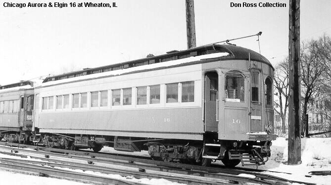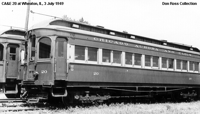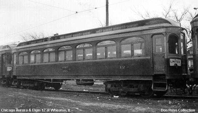 The baggage compartment on car 10, seen here in Wheaton yard in 1938, is not original. It was added circa 1910 and later removed. It was then reinstalled in 1933 and remained until the car was wrecked and scrapped in 1948.