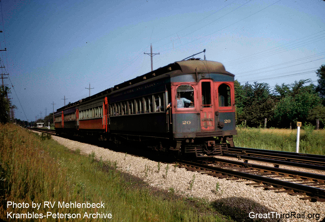 The year is somewhere around 1952 as we find car 20 leading a four car train at an as-of-yet unknown location on the main line. The paint on the 20 is looking rather dusty at this point. It will eventually be repainted into the brilliant red scheme that it will wear until the end of service.