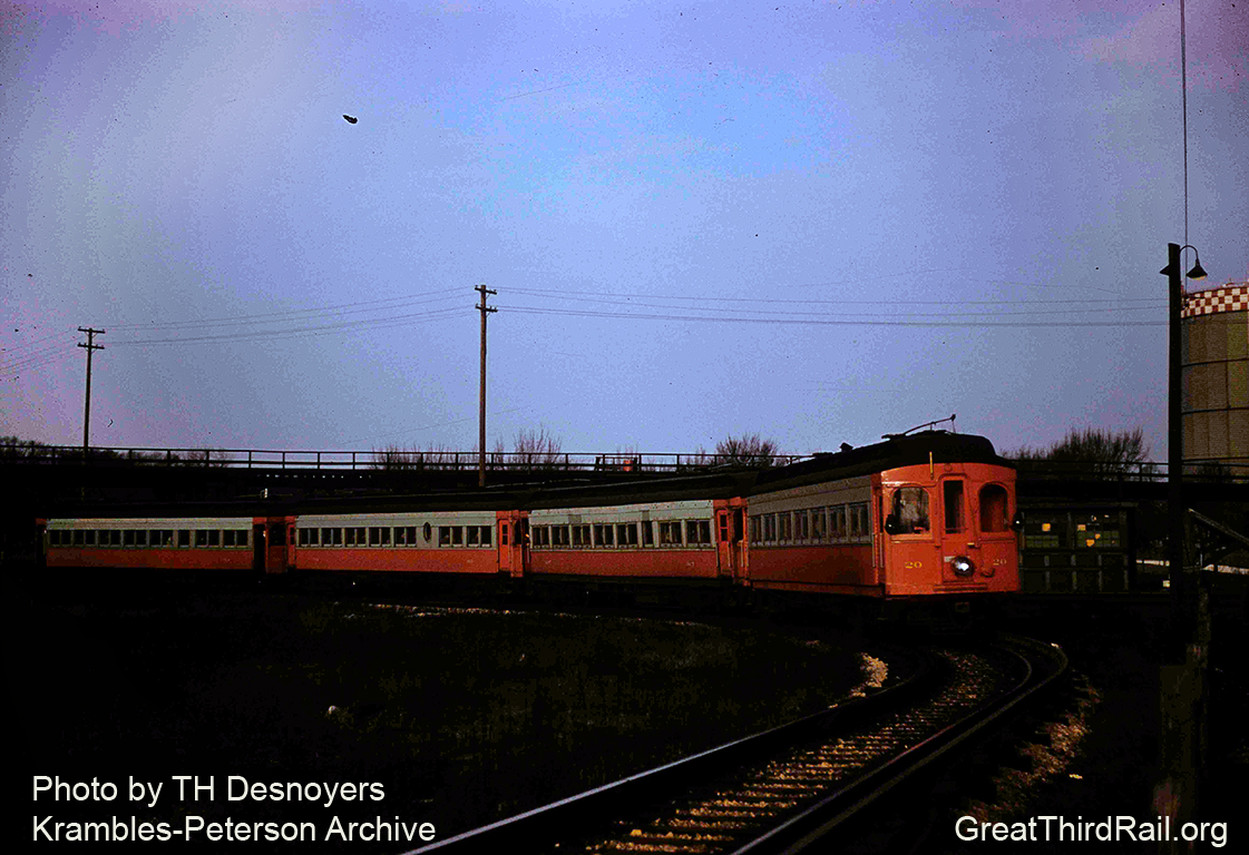 Car 20 is part of a four car train on the loop at Forest Park on March 13, 1957. In a matter of a few short months this scene will have stopped forever.