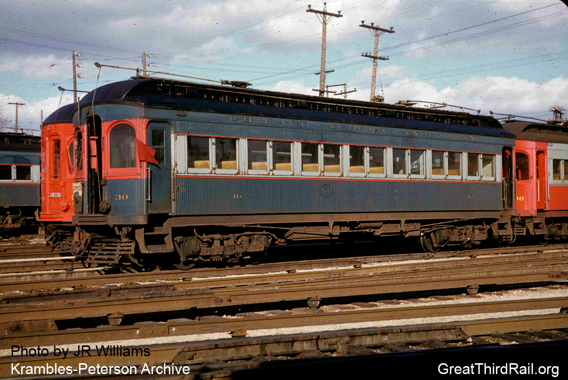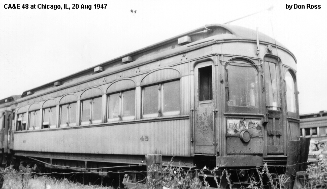 On August 20, 1947, car 48 still displays an early attempt by the Chicago Aurora & Elgin at modernizing the appearance of its older wooden cars. The stained glass windows the wooden cars were delivered with (which are now dated and long out of style) have been covered over, but the wooden arches which outlined them are still visible.