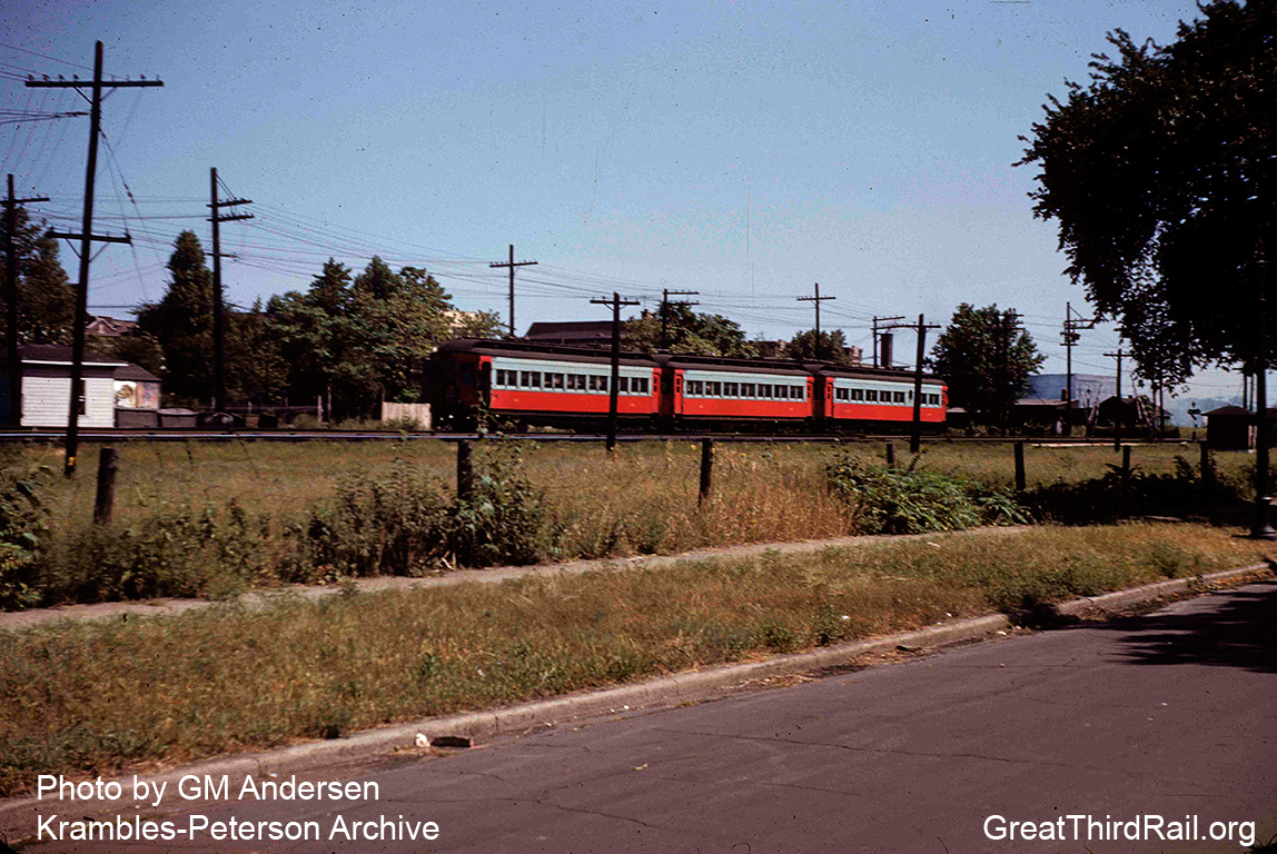 Car 30 sits in Wheaton Yard alongside an unidentified wood car in the brilliant red paint scheme circa 1952. Note the red flag on the 30 which signifies that this car just has been (or is about to be) at the tail end of a train.
