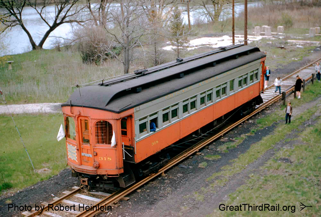 Car 318 is at Diehl Road’s westbound platform during a fan trip in the 1950s. In later years, the railroad painted its stations to match its rolling stock, as seen here. A railfan on the eastbound platform has raised the flagstop semaphore.