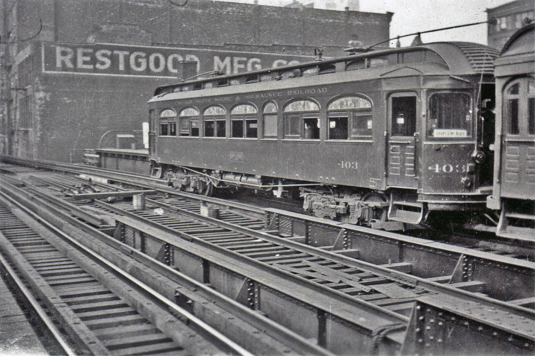 Chicago, North Shore & Milwaukee 403 is on the “L” at Roosevelt. The white sign in the motorcab window says "Shore Line Route," indicating that this photo dates from after 1926, when the Skokie Valley Route opened. 403 started out as a diner, but by this point the car has already been converted to a coach. When acquired by the CA&E in 1936, this car would be renumbered 144, so as not to numerically overlap with the 400 series.
